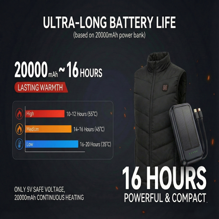 Break away from bulky layers and experience targeted warmth exactly where you need it. The Ember Core Vest delivers 8-10 hours of heat without restriction, powered by any USB power bank you already own. No proprietary batteries. No bulk. Just freedom from the cold.
